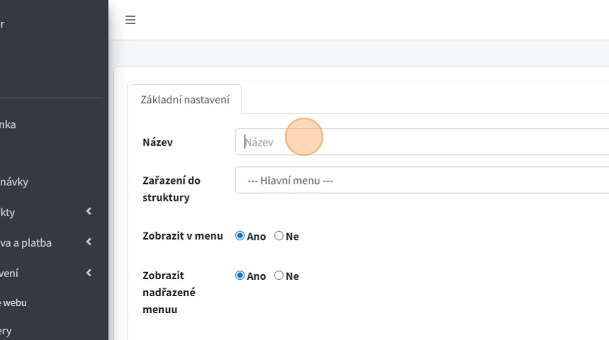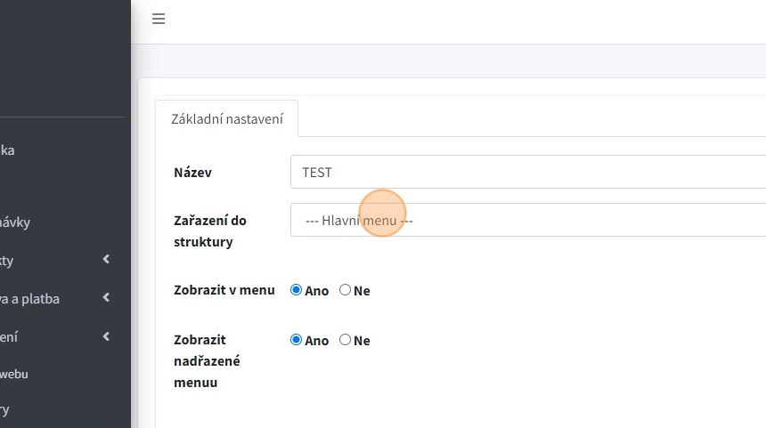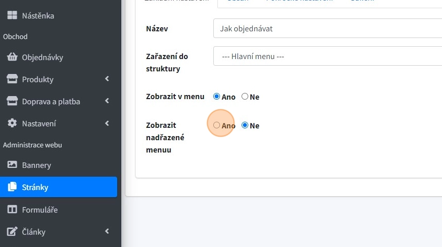 5. "Zobrazit v menu" - zvolení, zda se má nově vytvořená stránka zařadit do menu