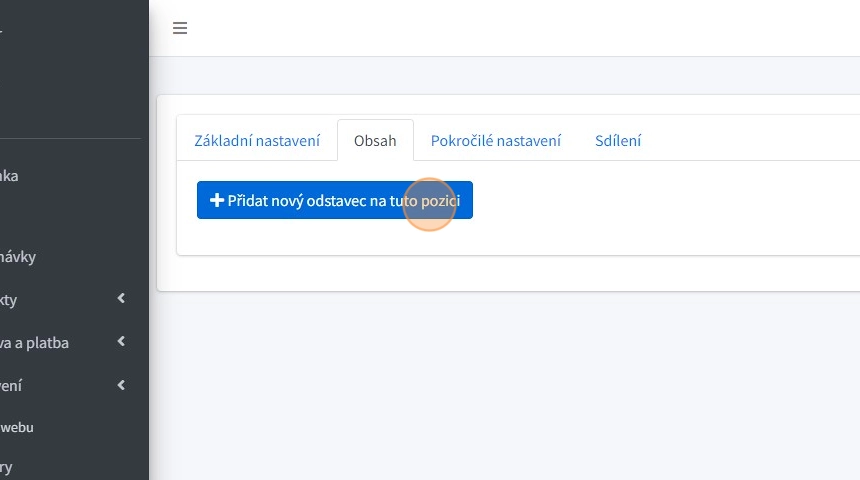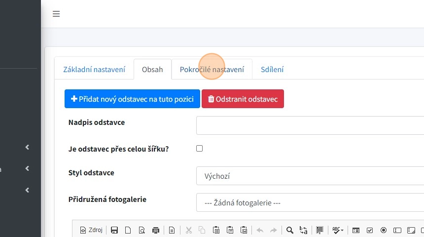 2. Pomocí "Přidat nový odstavec na tuto pozici" lze vytvářet odstavce (bloky obsahu) a do nich vkládat samotný obsah stránky