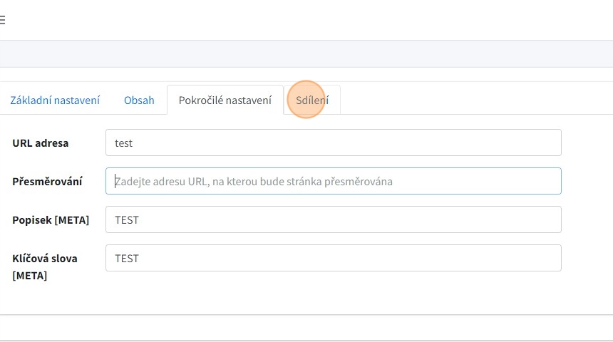 12. "Přesměrování" pole pro vyplnění URL adresy, na kterou chceme přesměrovat po přístupu na ni.