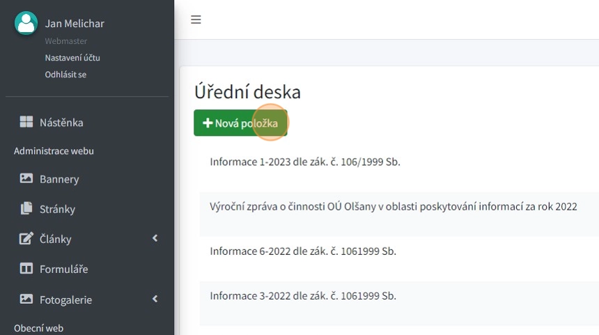 2. Tlačítkem "Nová položka" lze vytvořit nový záznam v úřední desky.