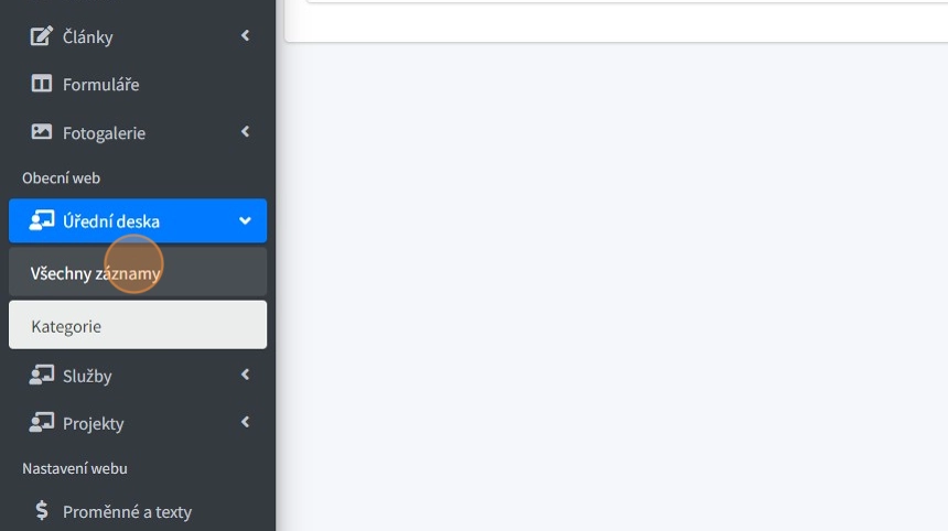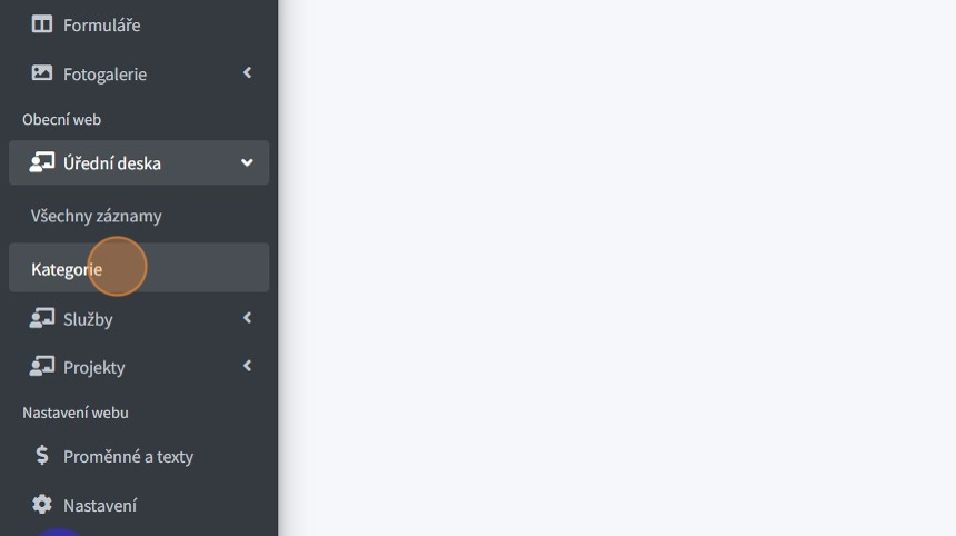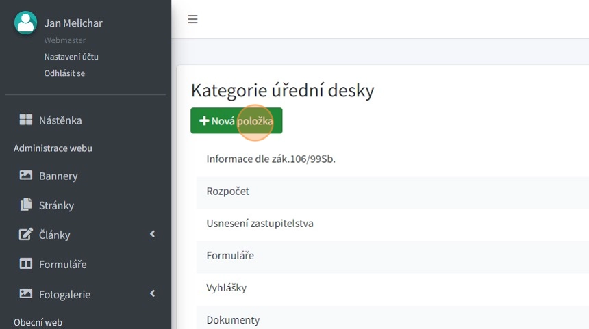1. Položka "Kategorie" - zde je možno vytvářet jednotlivé kategorie, do kterých j poté možno zařazovat záznamy v úřední desce.