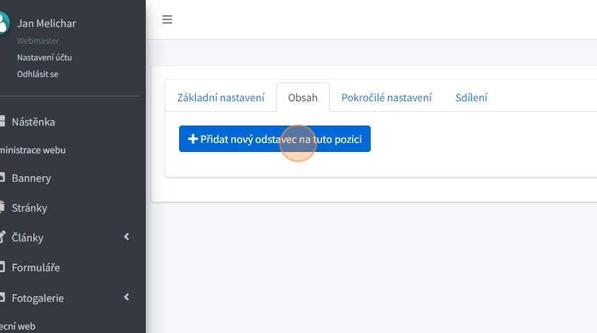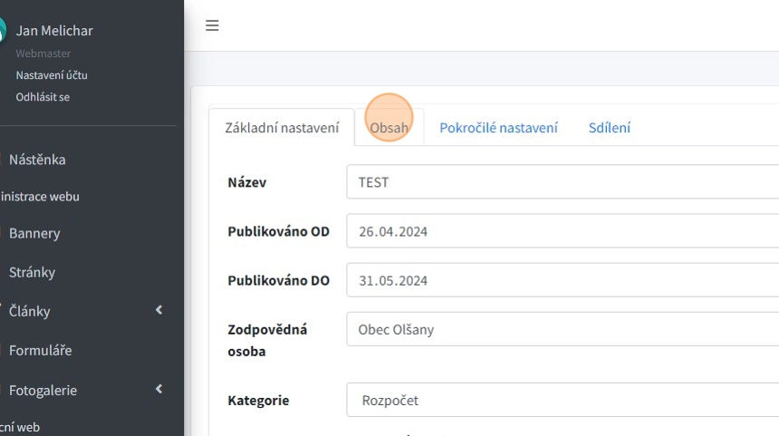 11. V záložce "Obsah" lze vytvářet nové odstavce pro samotný obsah záznamu úřední desky.